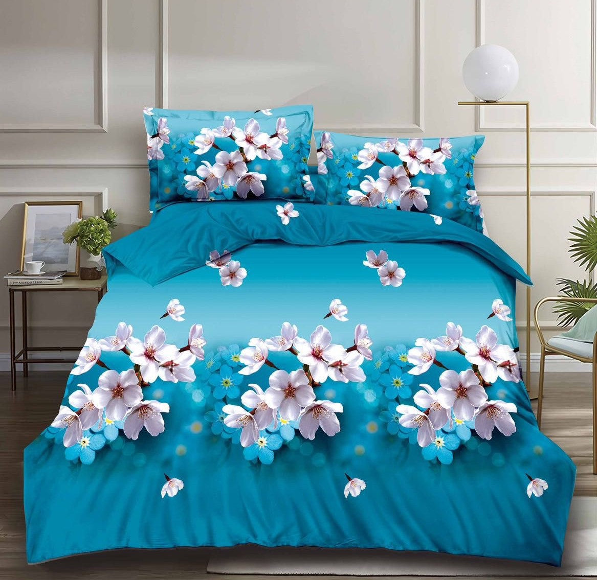 Set de lenjerie satinat 3D pentru pat dublu, într-o nuanță intensă de turcoaz oceanic, decorată cu flori spectaculoase de primăvară în nuanțe de alb, roz pal și bleu. Imprimeul 3D creează efect de adâncime și lumină, transformând patul în piesa centrală a dormitorului. Materialul satinat este fin, plăcut la atingere și ușor de întreținut, ideal pentru utilizare zilnică.