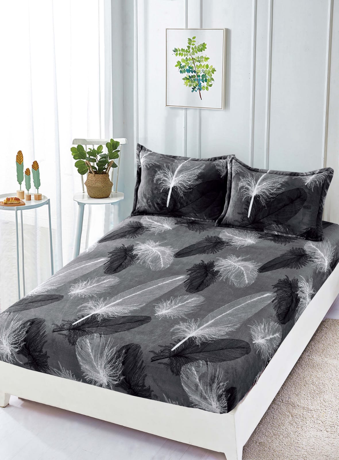 Husa de Pat Cocolino cu Elastic, 3 Piese – 180×200 cm, Model Pene, Alb/Gri/Negru, N15267