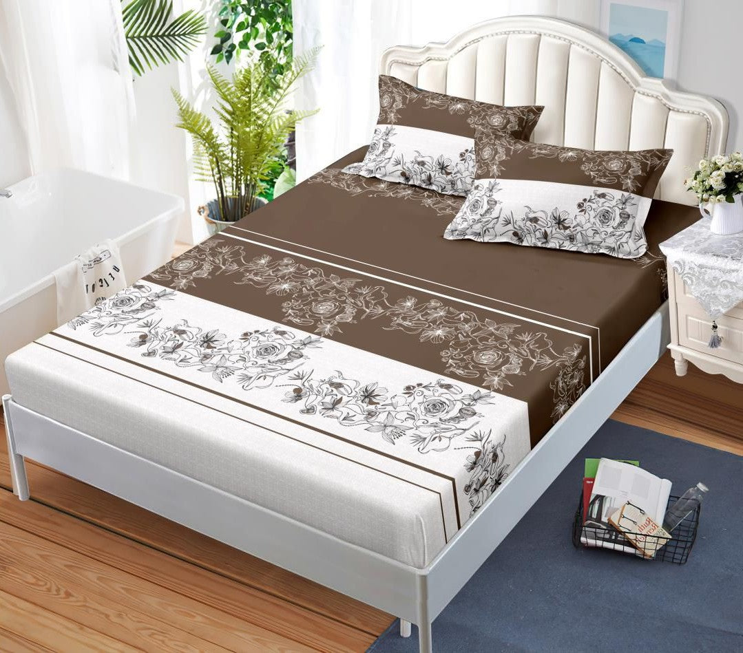 Husa de Pat Din Bumbac Finet cu Elastic 180X200, Floral Abstract, Alb/Maro G-182