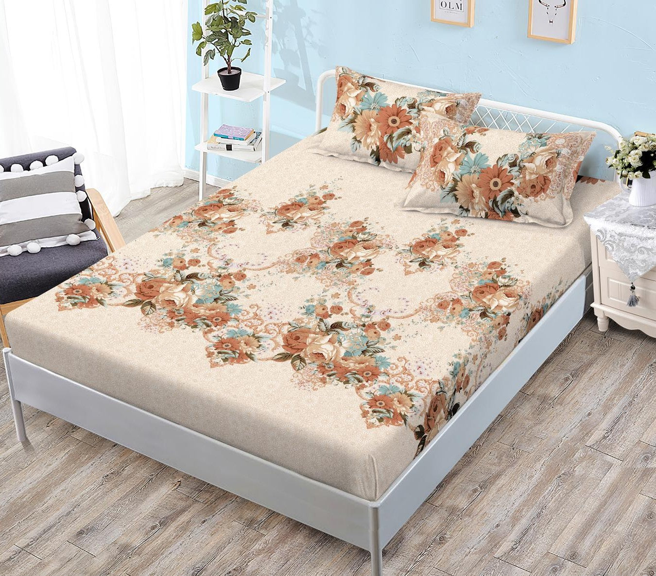 Husa de Pat Din Bumbac Finet cu Elastic 180X200, Floral, Bej/Maro G-93