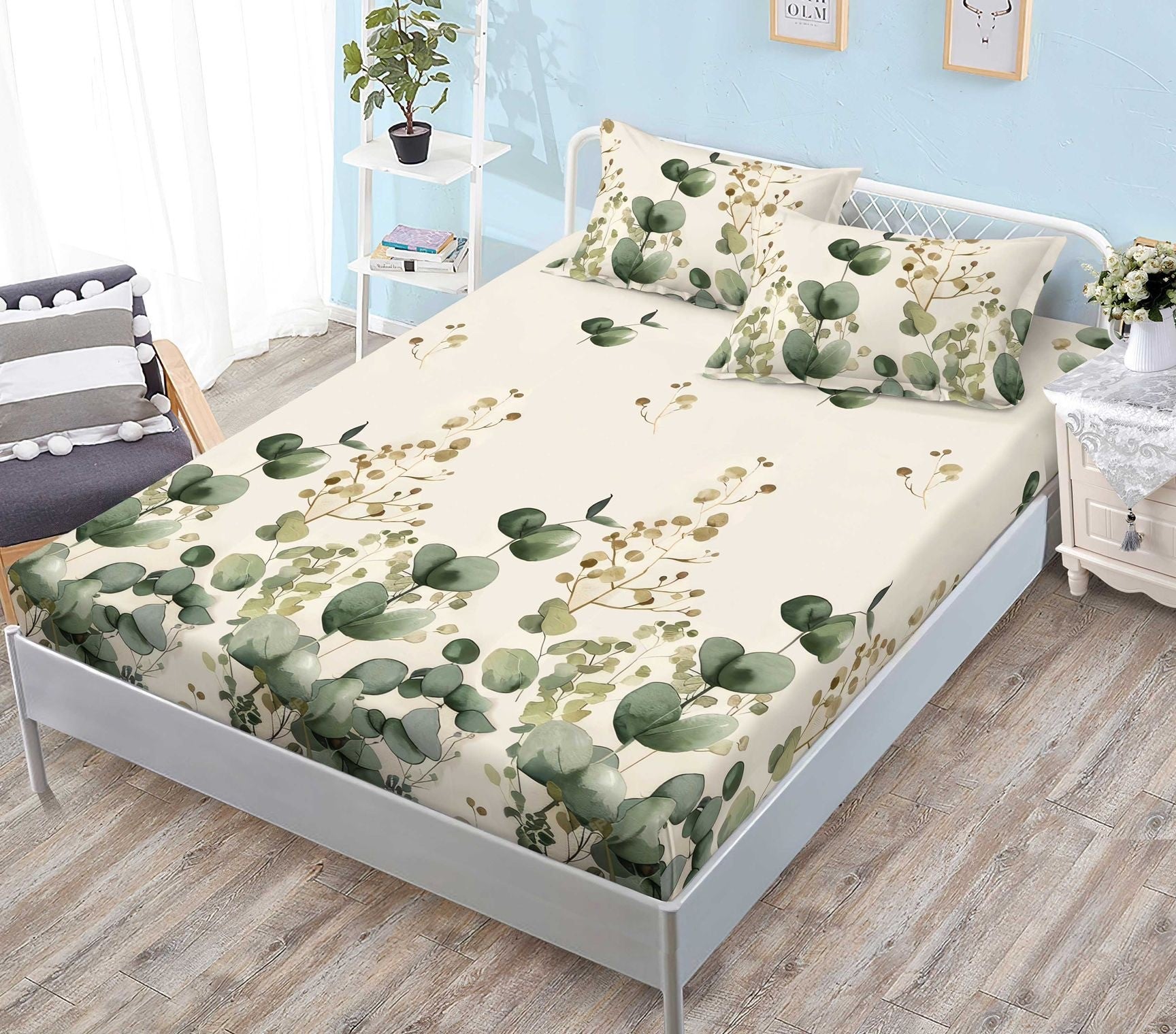 Husa de Pat Din Bumbac Finet cu Elastic 180X200, Floral, Crem/Kaki G-258