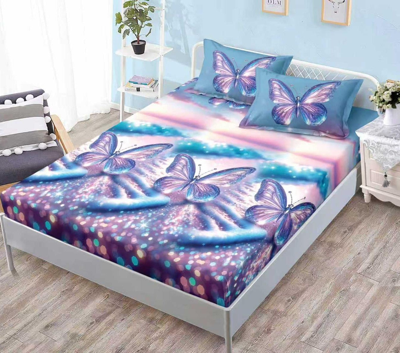 Husa de Pat Din Bumbac Finet cu Elastic, 180X200, Fluturi, Multicolor, G-303