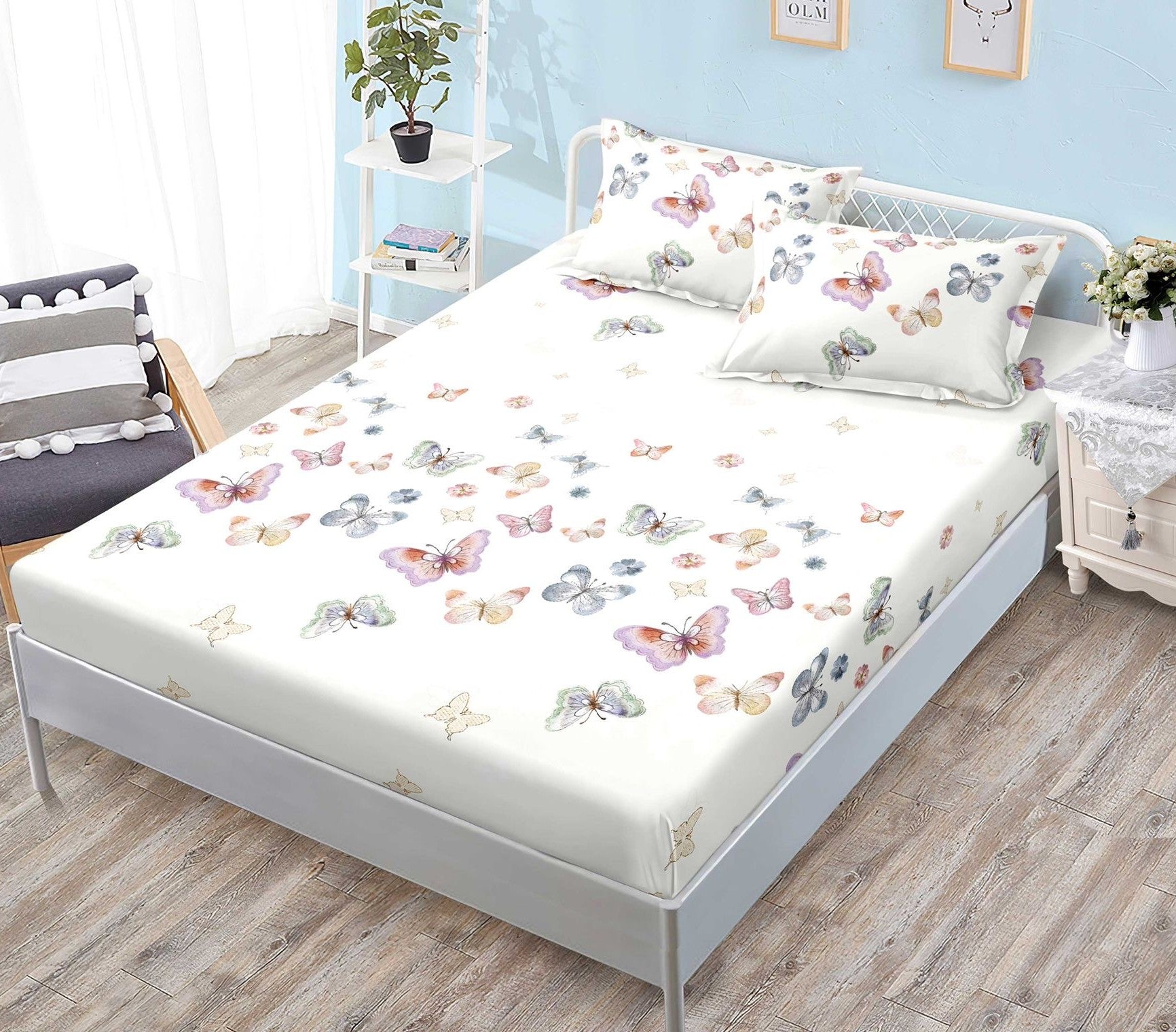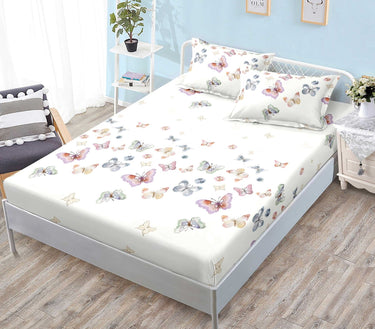 Husa de Pat Din Bumbac Finet cu Elastic 180X200, Fluturi Multicolori, Bej G-249