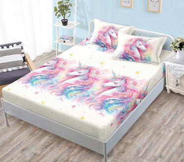 Husa de Pat Din Bumbac Finet cu Elastic 180X200, Unicorni, Roz/Bej/Albastru