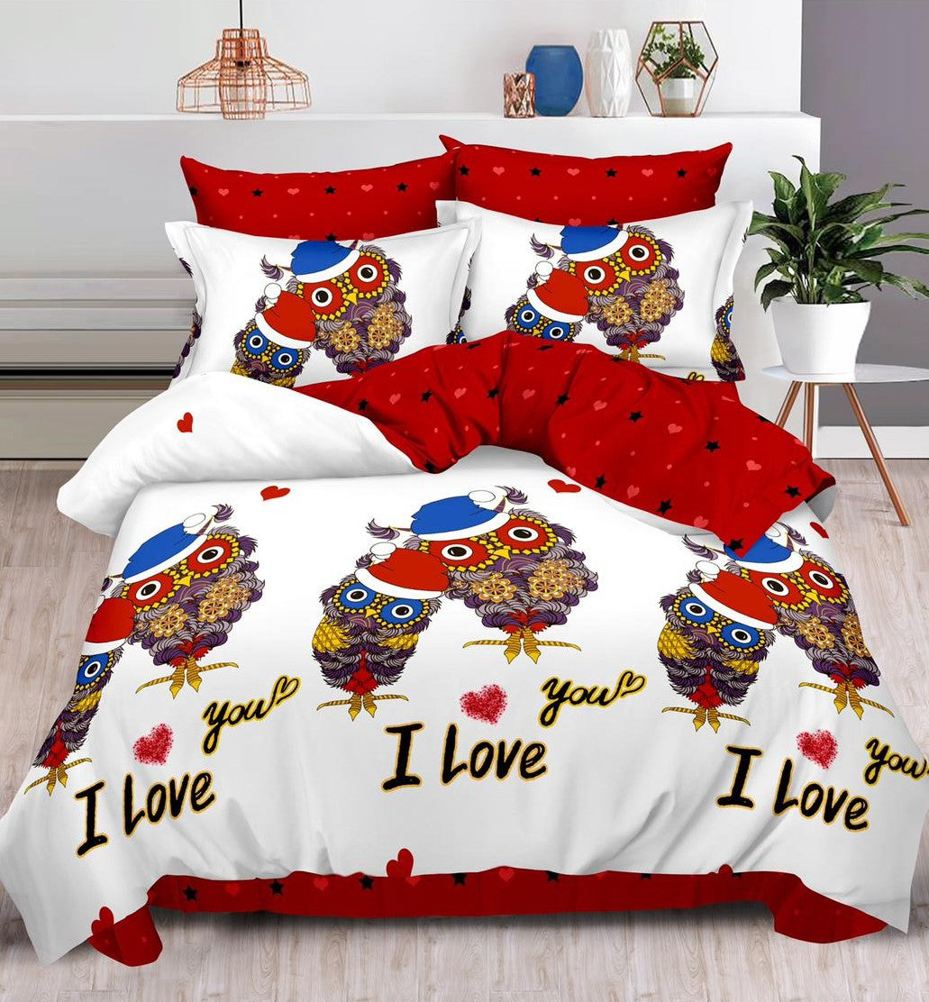 Un set de lenjerie vesel și romantic din finet gros 100% bumbac, perfect pentru cupluri sau pentru cei care iubesc modelele jucăușe. Fundalul alb este decorat cu bufnițe colorate îmbrăcate cu căciulițe roșii și albastre, inimioare roșii și mesajul scris mare „I Love You”. Cearceaful de pat și spatele pilotei sunt roșu intens, presărat cu steluțe și inimioare, pentru un efect de “love story” complet în dormitor.