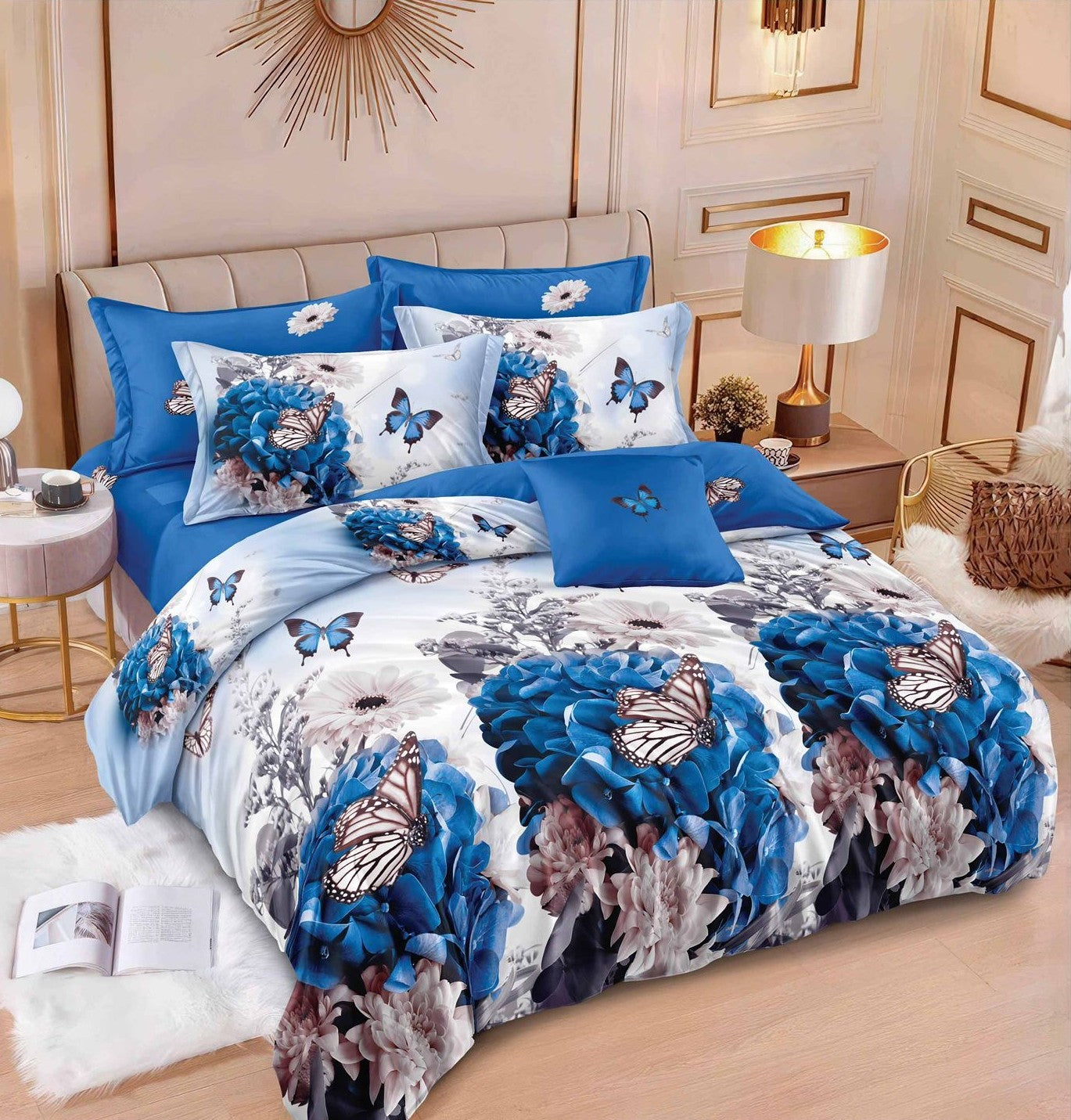 O lenjerie spectaculoasă din bumbac finet premium, cu un imprimeu complex de flori albastre și fluturi eleganți. Potrivită pentru dormitoarele moderne, oferă confort, rafinament și o atmosferă proaspătă.