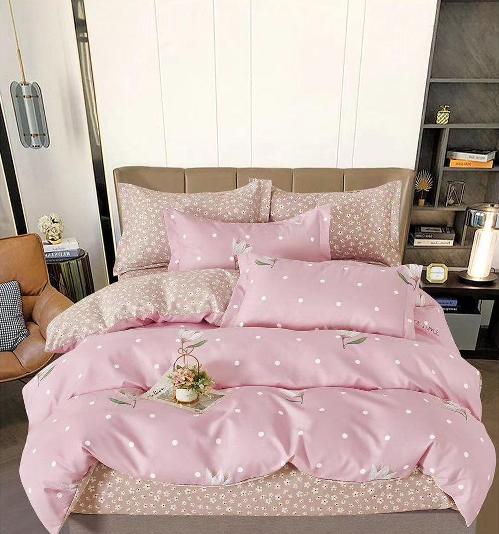 Lenjerie din finet gros premium, combinând două modele delicate: roz pastel cu buline albe și bej cald cu floricele mărunte. Pilota și unele fețe de pernă sunt roz, oferind un aspect luminos și feminin, iar cearceaful de pat și restul fețelor de pernă sunt bej floral, adăugând un contrast plăcut și elegant. Un set ideal pentru dormitoare luminoase, romantice sau minimaliste.