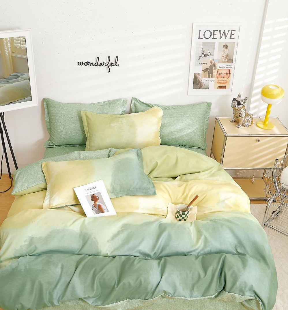 Set de lenjerie din finet gros cu efect ombre pastel în nuanțe de verde salvie, verde mentă și galben vanilie. Pernele îmbină verdele texturat cu zone ombre, iar cearceaful de pat este într-un verde deschis uniform, foarte liniștitor. Un set calm și luminos, ideal pentru dormitoare moderne, minimaliste sau natural-inspired.