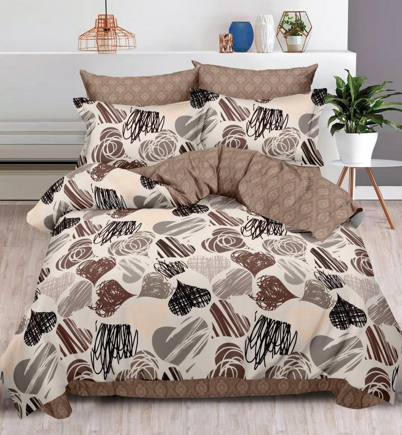 Lenjerie din finet gros în tonuri calde și naturale, cu fundal bej crem, decorat cu inimioare abstracte în nuanțe de maro, cappuccino, gri și negru. Modelul combină linii desenate, forme pline și efecte grafice moderne. Verso-ul pilotei și cearceaful de pat sunt într-un maro cald cu model geometric fin, elegant și discret. Un set perfect pentru dormitoare în stil natur, clasic sau modern cu accente pământii.