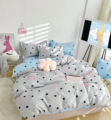 Set de finet gros premium într-o combinație modernă de gri deschis cu inimioare bleumarin și accente roz pastel. Fețele de pernă sunt mixte, unele gri cu inimioare, altele în nuanță de albastru deschis (bleu), perfecte pentru a lumina vizual dormitorul. Model jucăuș, fresh și ideal pentru camere tinerești, minimaliste sau romantice.