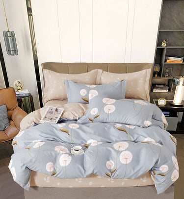 Set de lenjerie din finet gros în combinația rafinată de bleu deschis și bej cald. Pilota și o parte din fețele de pernă prezintă un imprimeu delicat cu flori pufoase/puf de păpădie în nuanțe pastelate, iar cearceaful de pat și fețele de pernă bej au un imprimeu fin cu frunzulițe albe. Un model liniștitor și elegant, perfect pentru dormitoarele luminoase și spațiile decorate în stil natural sau scandinav.