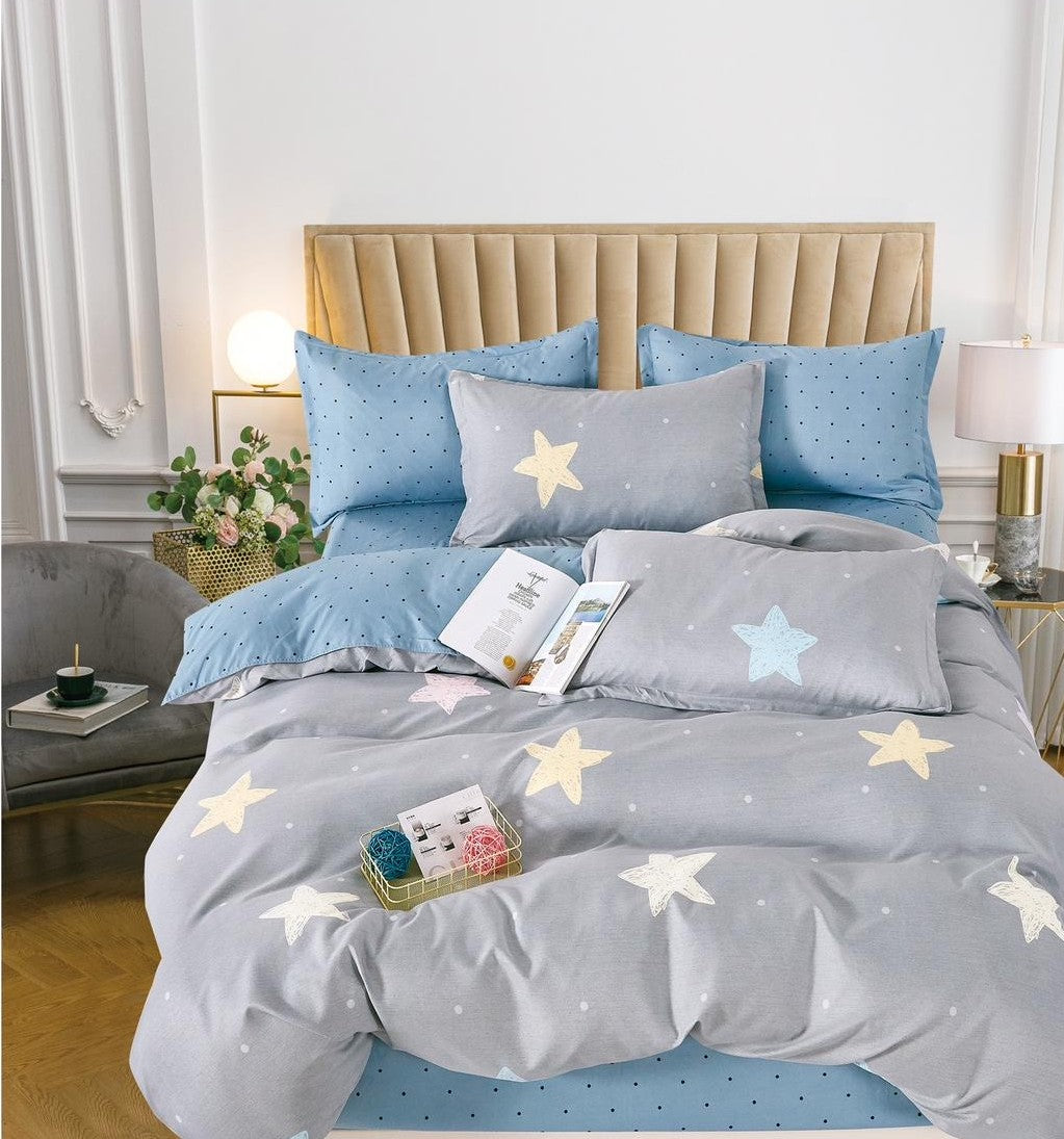 Lenjerie Finet 6 Piese – Stele Pastel pe Gri & Cearceaf Bleu cu Buline