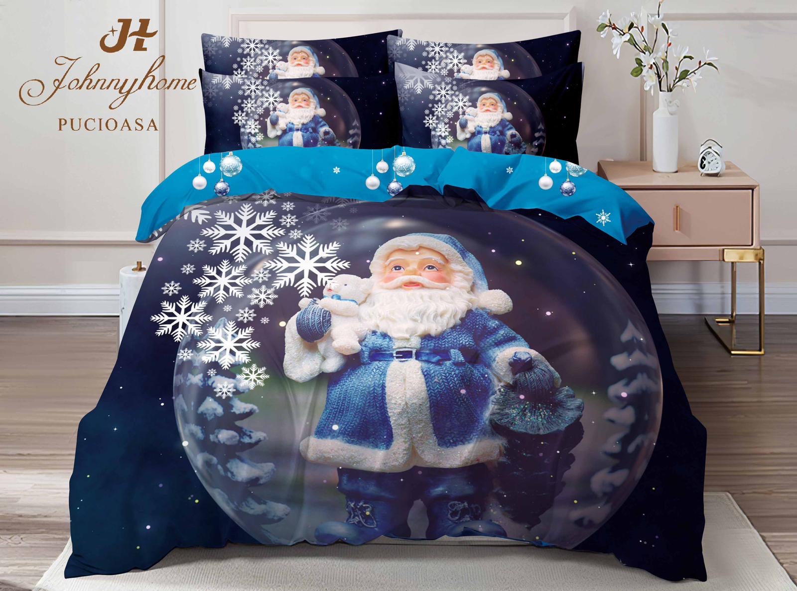 Un model de iarnă elegant și diferit de clasicul roșu, realizat din finet gros, în nuanțe profunde de albastru închis și turcoaz. Imaginea centrală îl prezintă pe Moș Crăciun îmbrăcat în costum albastru, cu blăniță albă, ținând în brațe un ursuleț, în interiorul unei bile de cristal înconjurate de fulgi mari de nea. Fundalul este un cer de noapte cu stele, iar banda de la cearceaf este turcoaz, decorată cu globuri albastre și argintii atârnate, pentru un efect de decor de vitrină de iarnă. Fețele de pernă reiau scena cu Moșul albastru și globul de cristal, creând un set armonios, calm și foarte fotogenic.