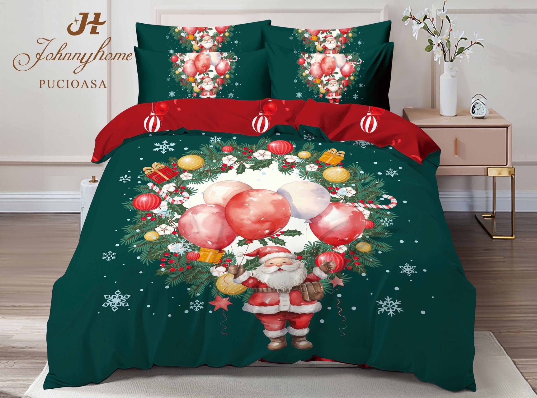 - Lenjerie de Crăciun din finet premium cu Moș Crăciun și baloane pe fundal verde închis.