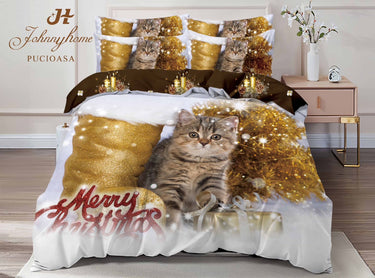- Lenjerie premium de Crăciun cu pisicuță și decor auriu strălucitor.