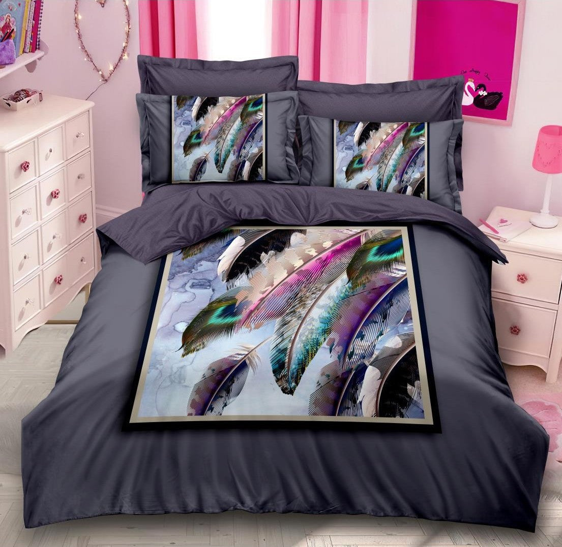 Un model spectaculos și elegant, realizat din finet gros 100% bumbac. Lenjeria Feathers Art Violet combină nuanțe rafinate de violet închis cu imprimeu artistic de pene multicolore, având accente în tonuri de turcoaz, fuchsia, mov și bej. Un design modern, extravagant și perfect pentru dormitoare cu personalitate.
