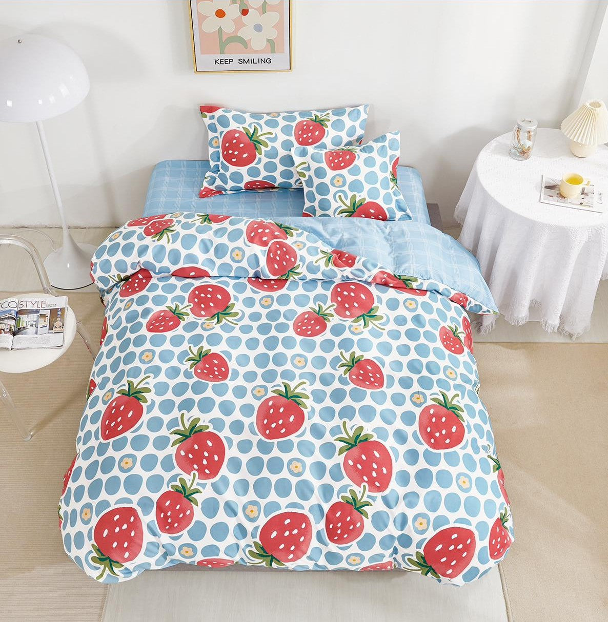 Lenjerie de pat cu elastic, UNI, Pat 1 Persoana, 4 Piese, Capsuni, Albastru/Rosu, T60-114