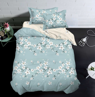 Lenjerie de pat cu elastic, UNI, Pat 1 Persoana, 4 Piese, Flori, Bej/Albastru, T60-44