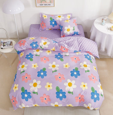 Lenjerie de pat cu elastic, UNI, Pat 1 Persoana, 4 Piese, Flori Multicolore, Violet, T60-79
