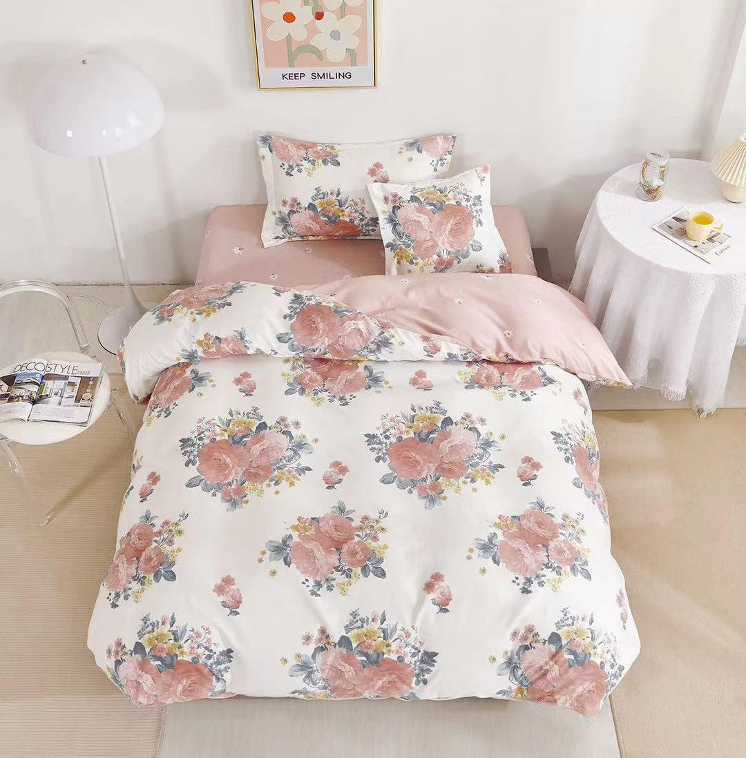Lenjerie de pat cu elastic, UNI, Pat 1 Persoana, 4 Piese, Flori, Roz/Bej, T60-102