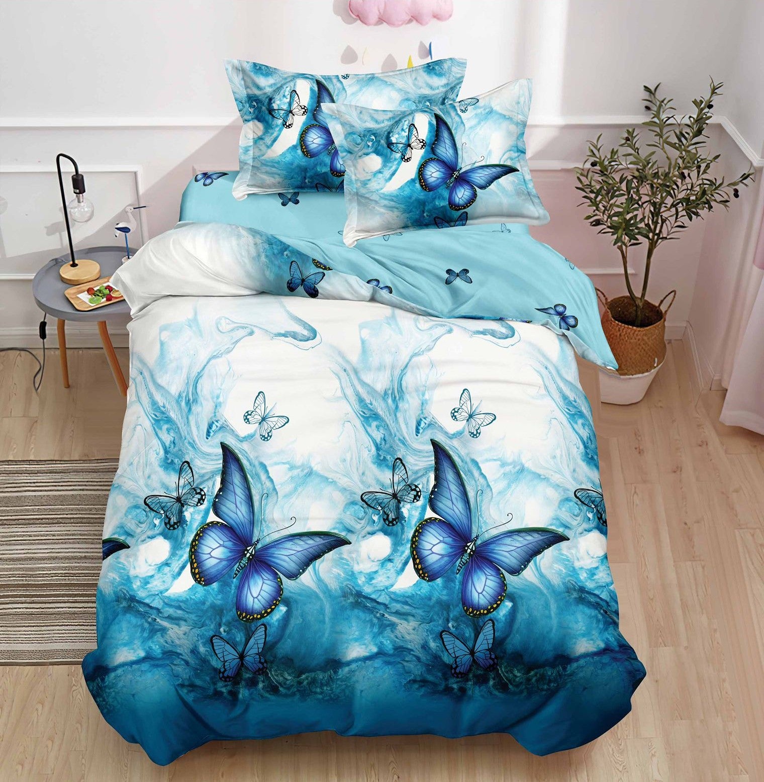 Lenjerie de pat cu elastic, UNI, Pat 1 Persoana, 4 Piese, Fluturi, Albastru/Bleu, T60-140