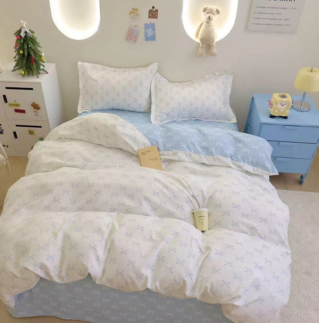 Setul conține 4 piese, cu dimensiuni atent alese pentru paturile single: cearceaf de pat cu elastic 140 × 220 cm + 25 cm, cearceaf de pilotă 155 × 200 cm, o față de pernă 55 × 75 cm și o față de pernă 50 × 50 cm.