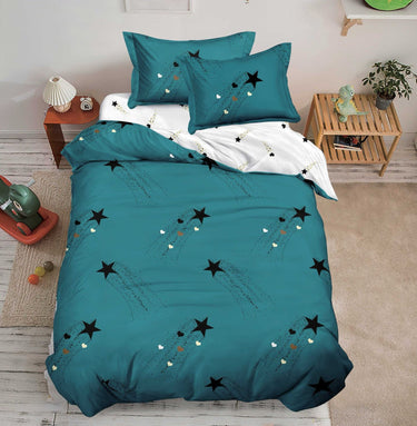 Lenjerie de pat cu elastic, UNI, Pat 1 Persoana, 4 Piese, Stele/Inimioare, Alb/Turcoaz, T60-02