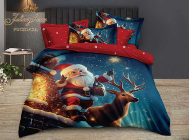 Adu magia nopții de Ajun direct în dormitor cu această lenjerie de pat din finet gros, fără elastic. Pilota prezintă un Moș Crăciun vesel, aflat pe acoperiș lângă un coș luminat auriu, alături de renul său, sub un cer albastru înstelat și o stea căzătoare care strălucește deasupra lor. Cearceaful de pat și o parte dintre fețele de pernă sunt roșii aprins, cu fulgi de nea albi, completând perfect scena de poveste de pe pilotă.