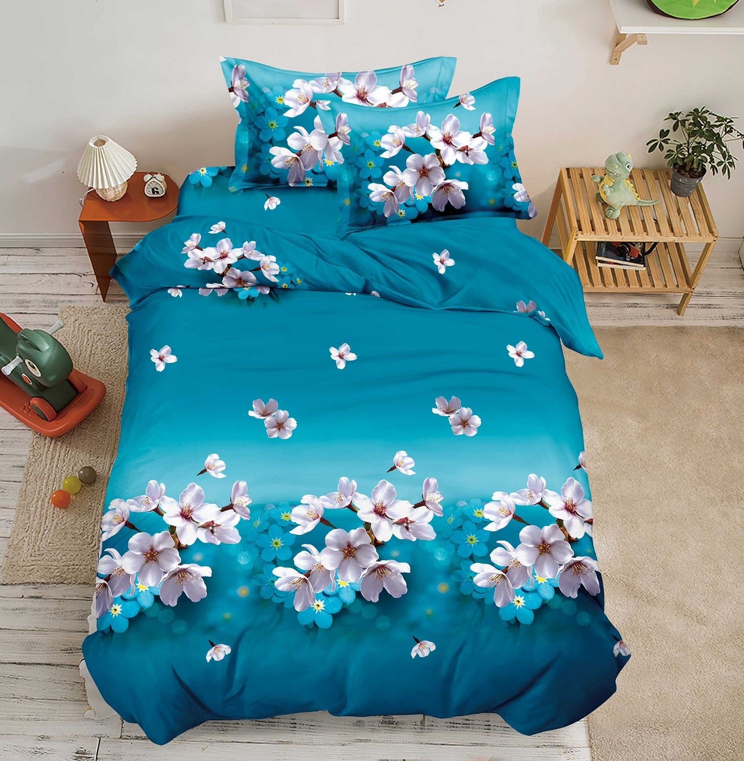 Lenjerie pat 1 Persoana, 4 PIESE, Bumbac Satinat, 3D, Model Floral, Albastru, BG-25