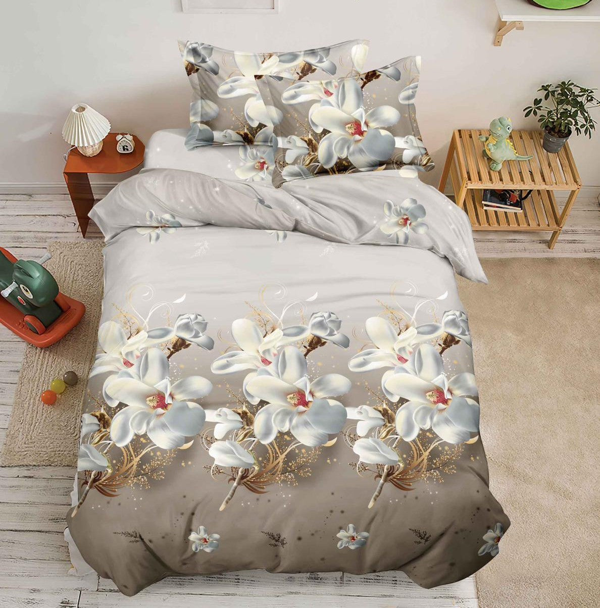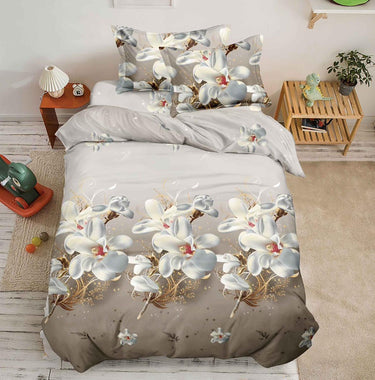 Lenjerie pat 1 Persoana, 4 PIESE, Bumbac Satinat, 3D, Model Floral, Gri BG-08