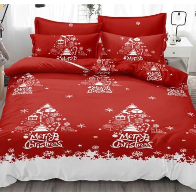 Lenjerie pat 2 persoane, 6 Piese, Bumbac Finet, Rosu/Alb, Merry Christmas, ST11094