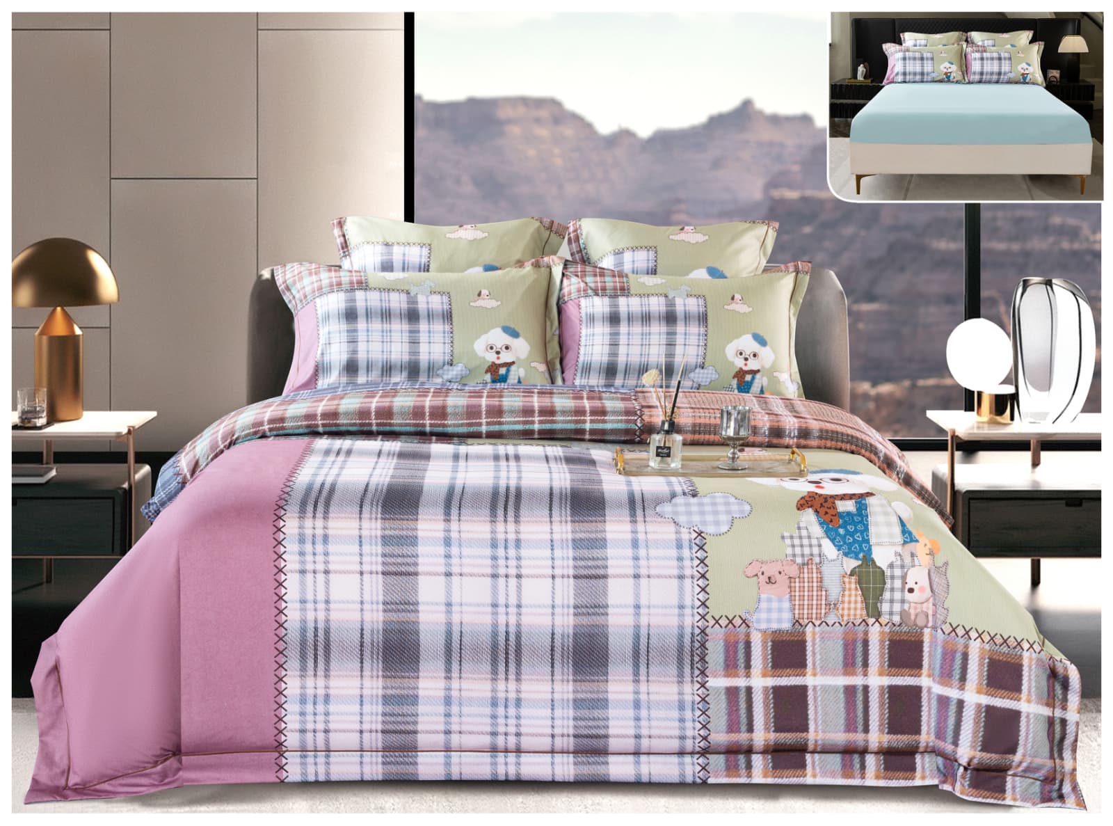 Lenjerie pat, Bumbac Satinat, 6 Piese, Carouri, Multicolor, PT13716-Elastic