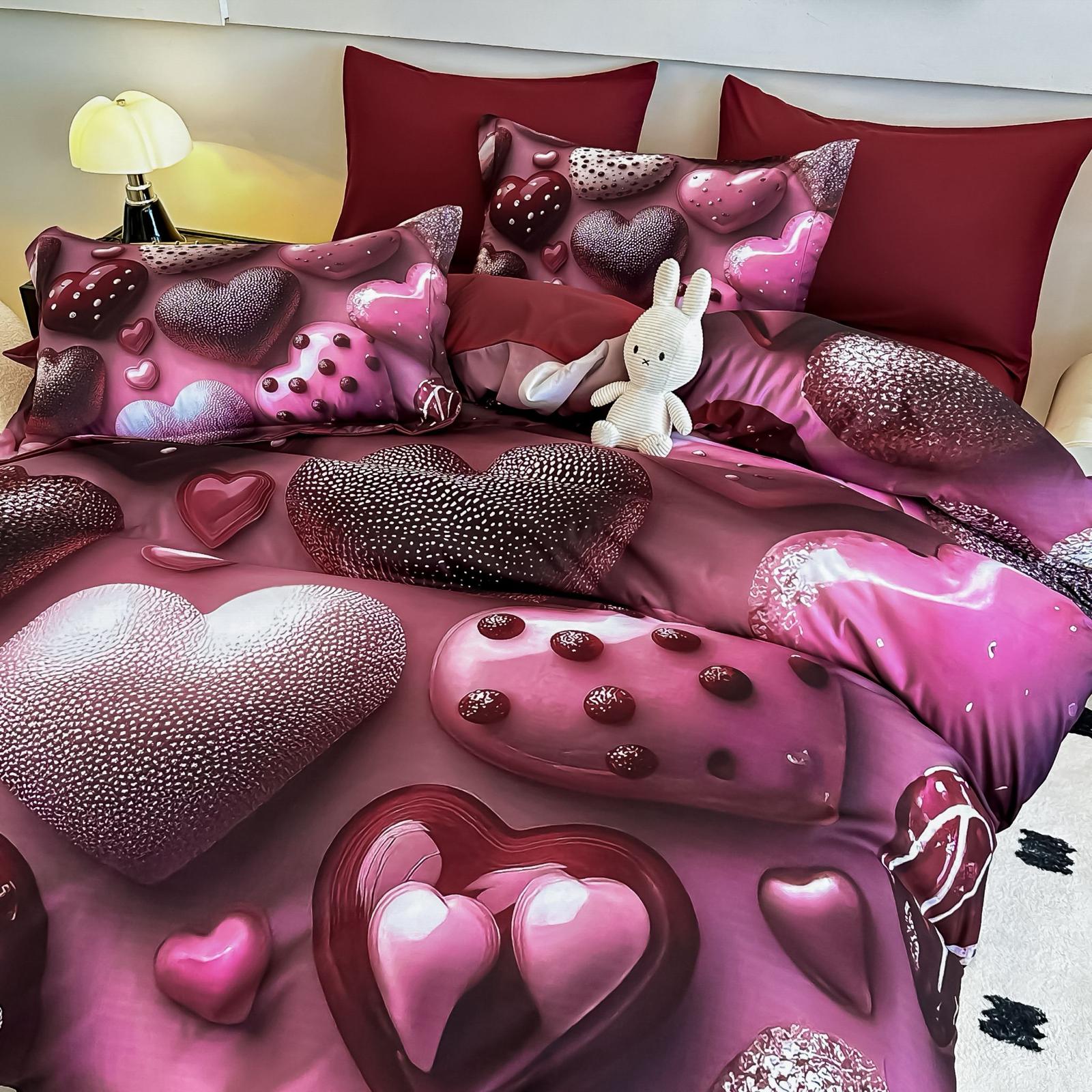 Lenjerie pat dublu, 6 PIESE, 5D, Bumbac Finet, Inimioare, Multicolor, J1243