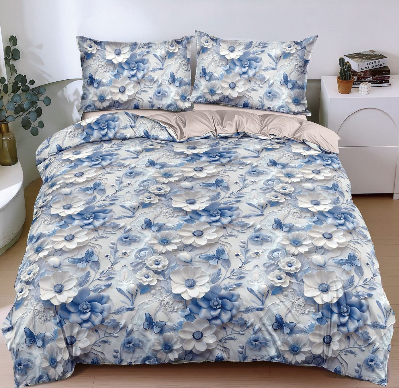 Lenjerie Pat Dublu, Bumbac Satinat 4 Piese, Floricele, Bleu/Crem, A50-693