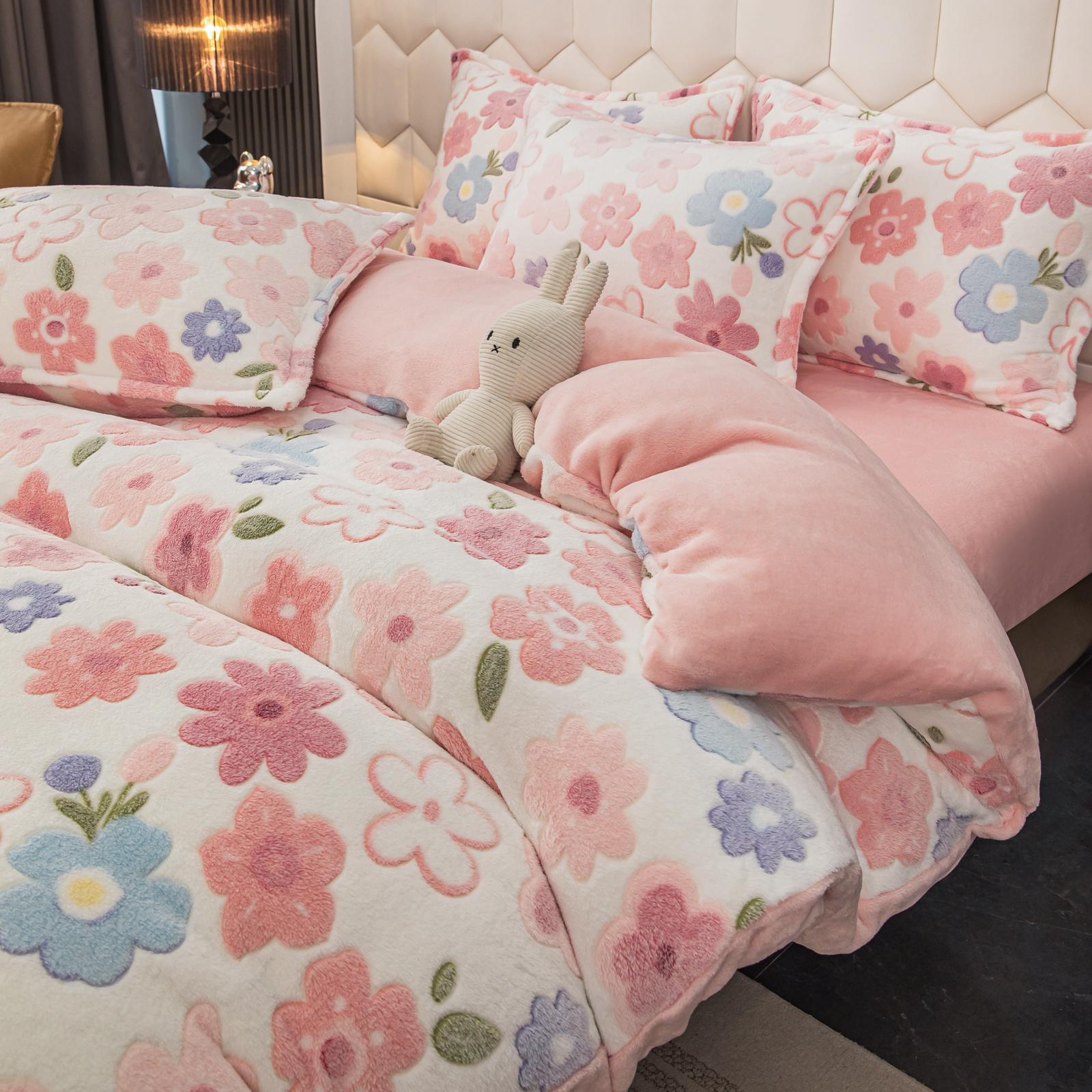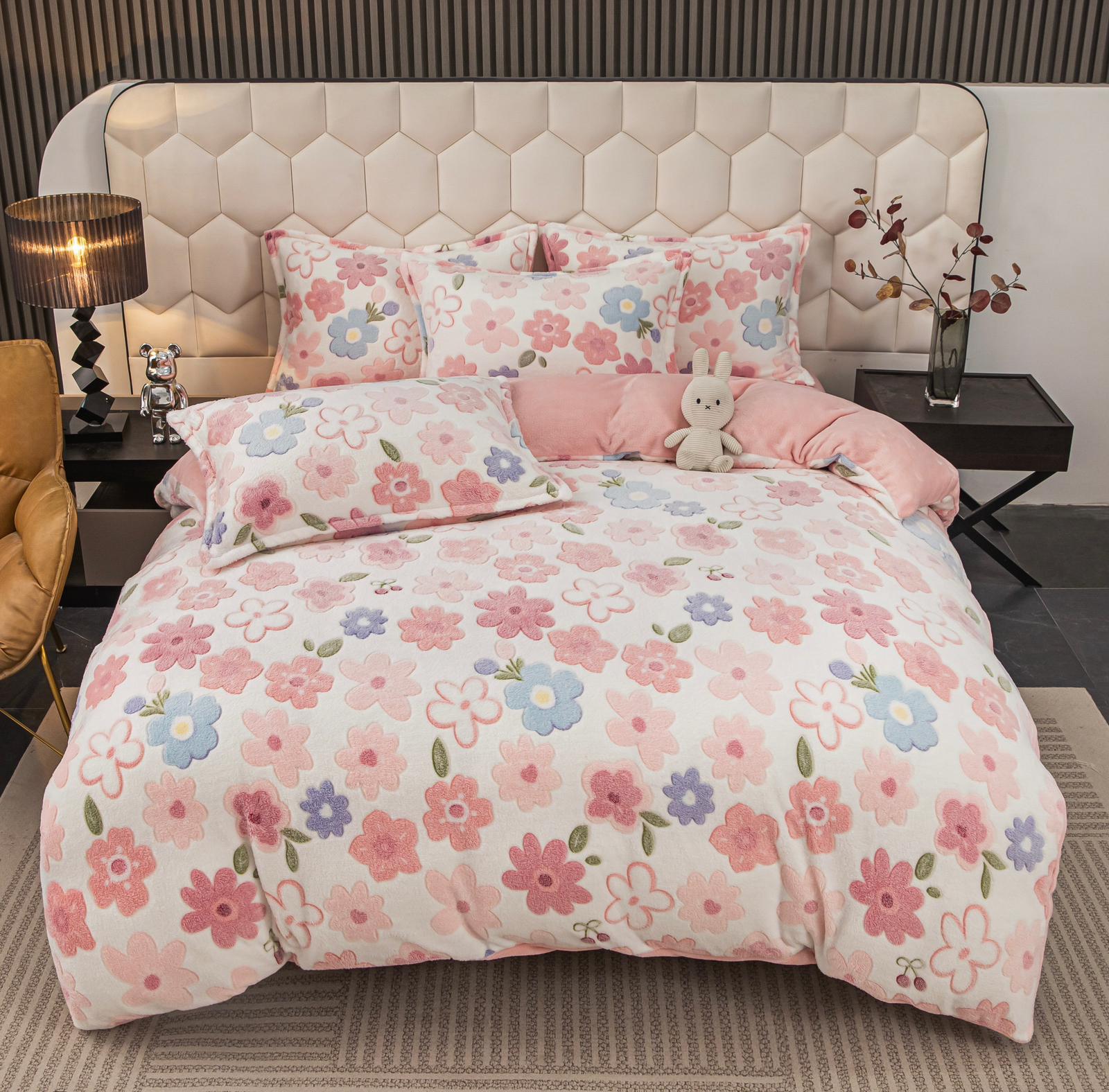 Lenjerie Pat Dublu cu Elastic, Material Pufos Cocolino, 4 Piese, Floricele, Alb/Roz, J1278-Elastic