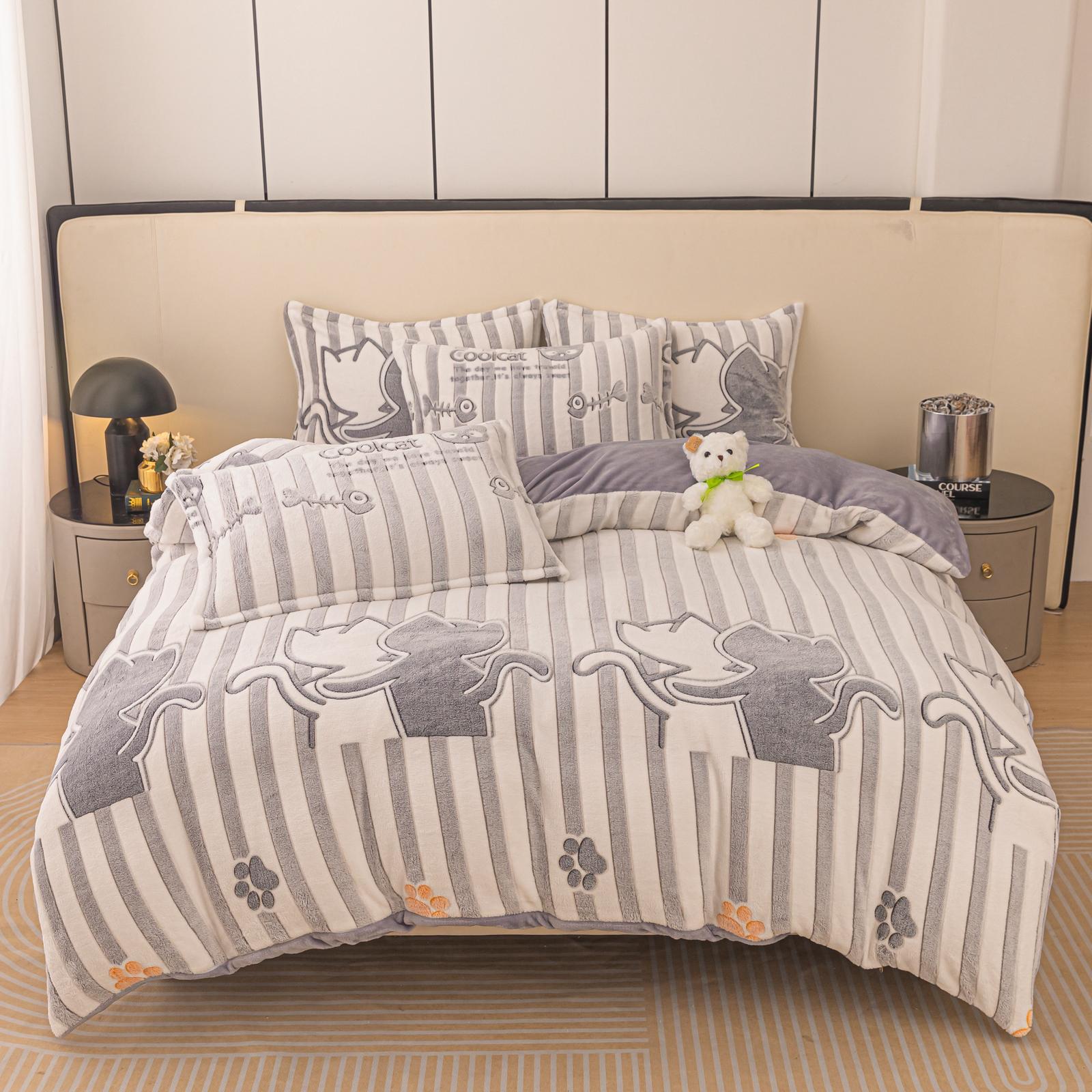 Lenjerie Pat Dublu cu Elastic, Material Pufos Cocolino, 4 Piese, Pisicute, Alb/Gri, J1274-Elastic