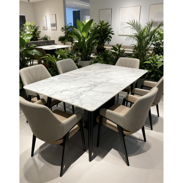 Modelul CT499 Alb este o masă dining modernă, cu un design elegant și luminos. Blatul alb tip piatră oferă un aspect premium și rafinat, ideal pentru spații moderne și aerisite.