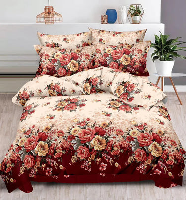 Pachet Promotional, Lenjerie Pat Dublu, 6 Piese, Bumbac Finet, Floricele, Crem/Grena, R60-454