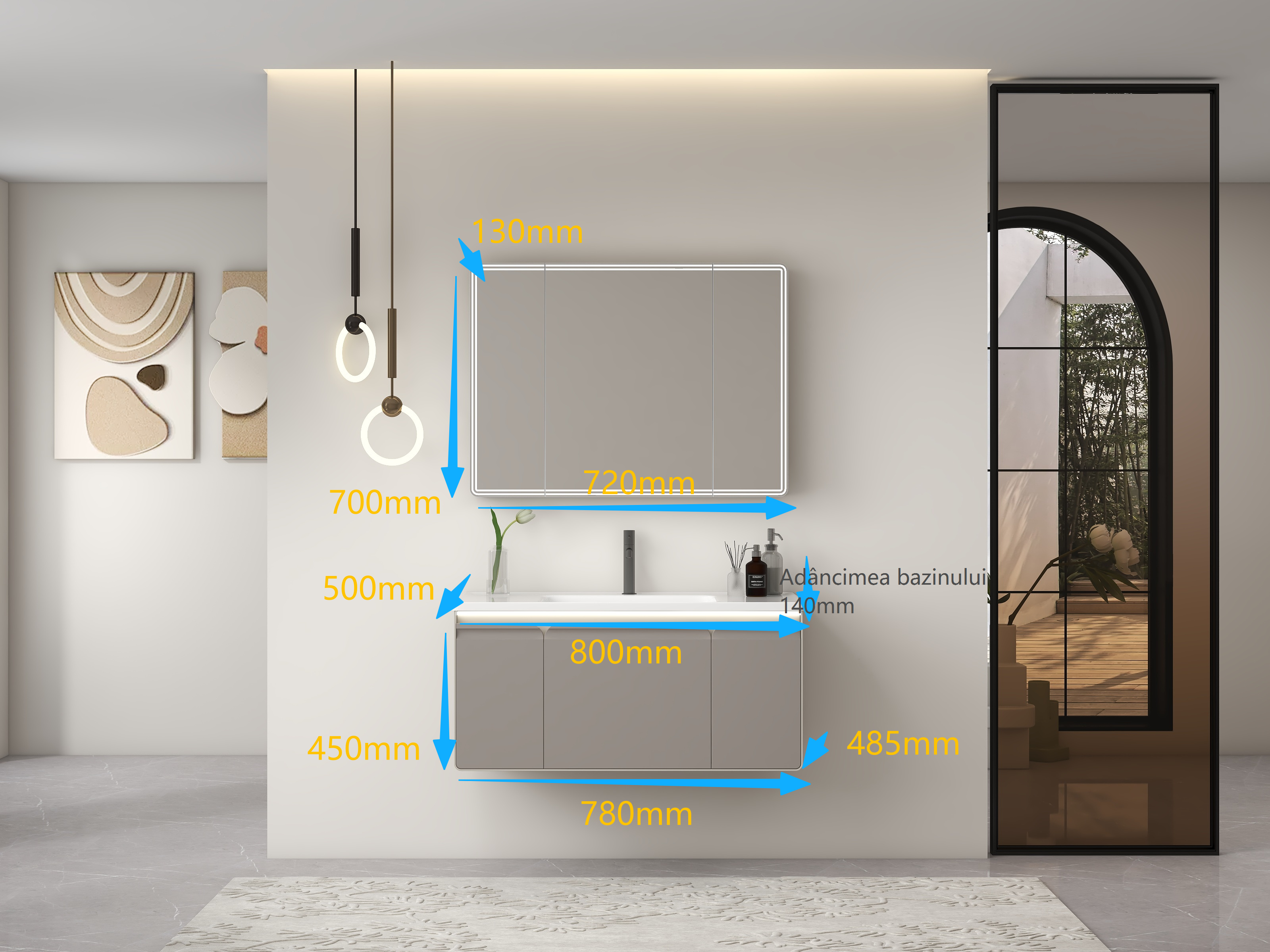 • Design elegant gri crem • dulap 800×500×450 mm • dulap oglindă 750×130×700 mm.