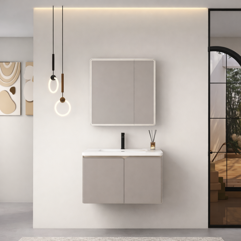 Set Mobilier Baie 80 cm – Dulap cu Uși Duble, Chiuvetă Ceramică Integrată și Oglindă cu Senzor Inteligent, Gri Crem