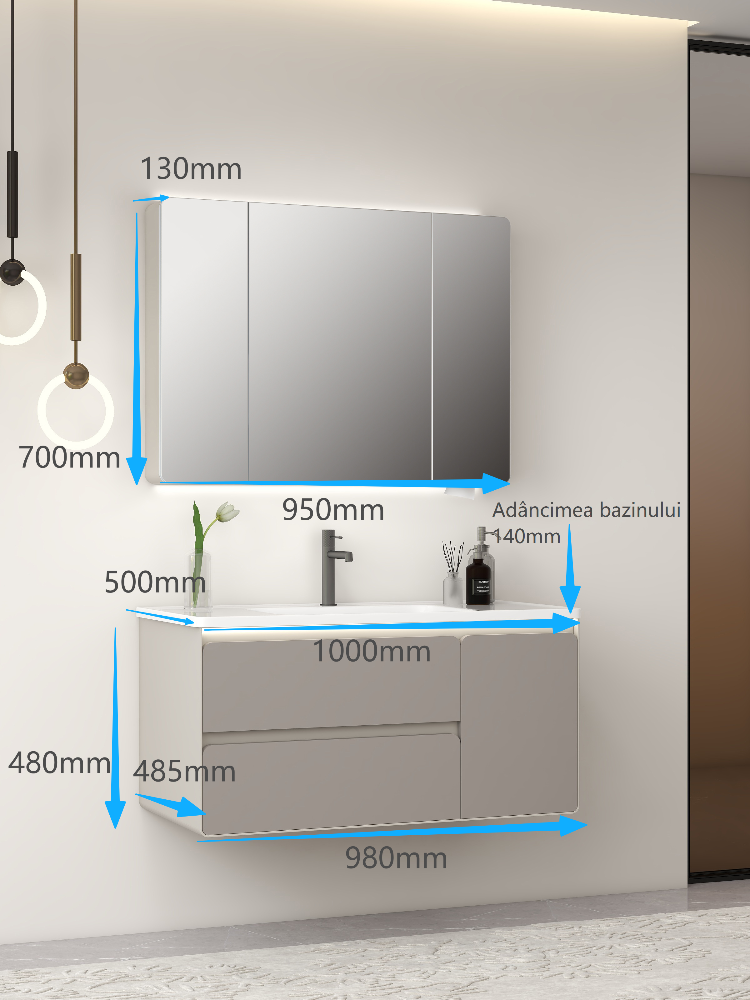 - Design elegant gri crem • dulap 980×490×480 mm • oglindă 950×135×700 mm.