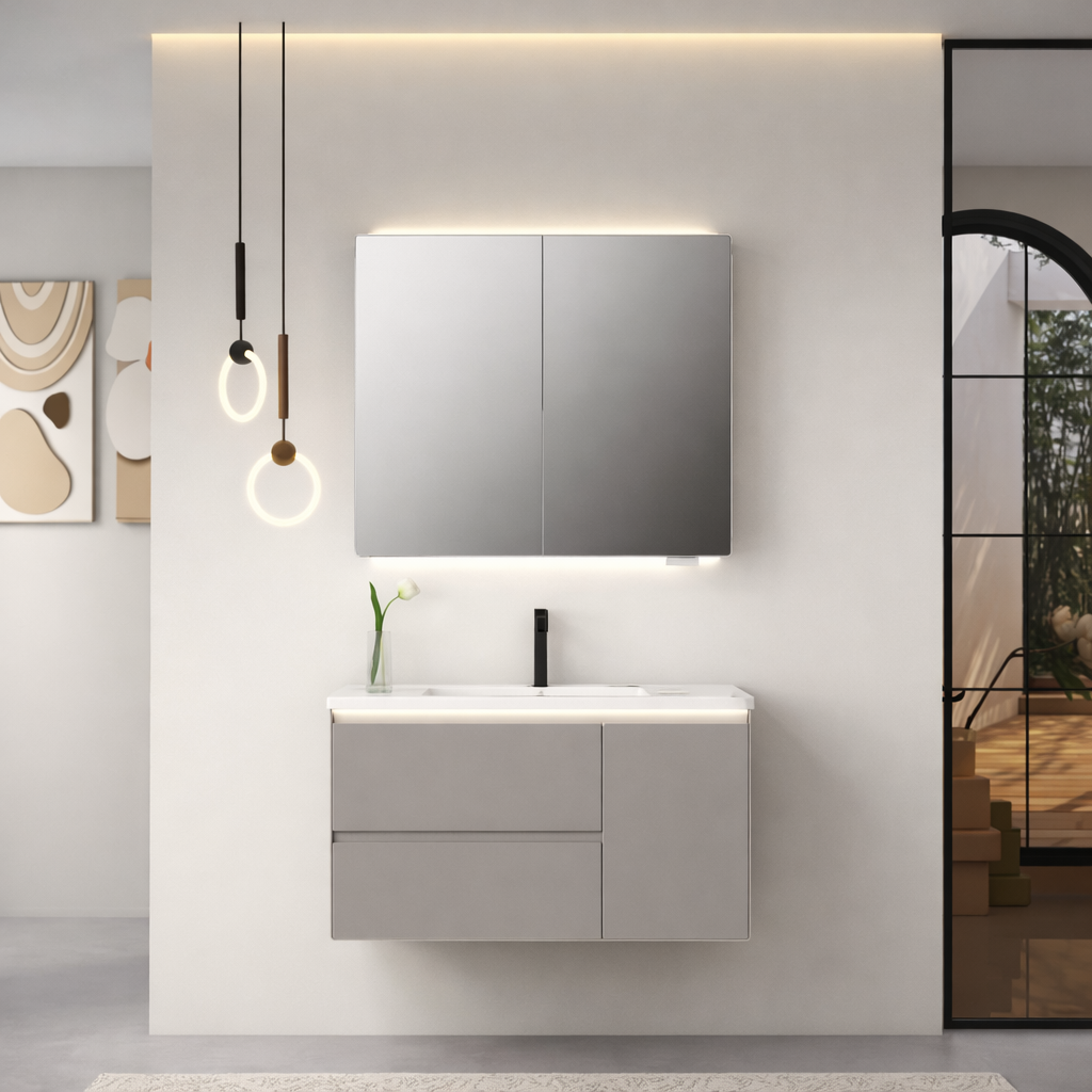 Set Mobilier Baie 98 cm – Sertare Duble, Ușă Laterală, Chiuvetă Ceramică Integrată și Oglindă cu Lumină Tactilă Inteligentă, Gri Crem