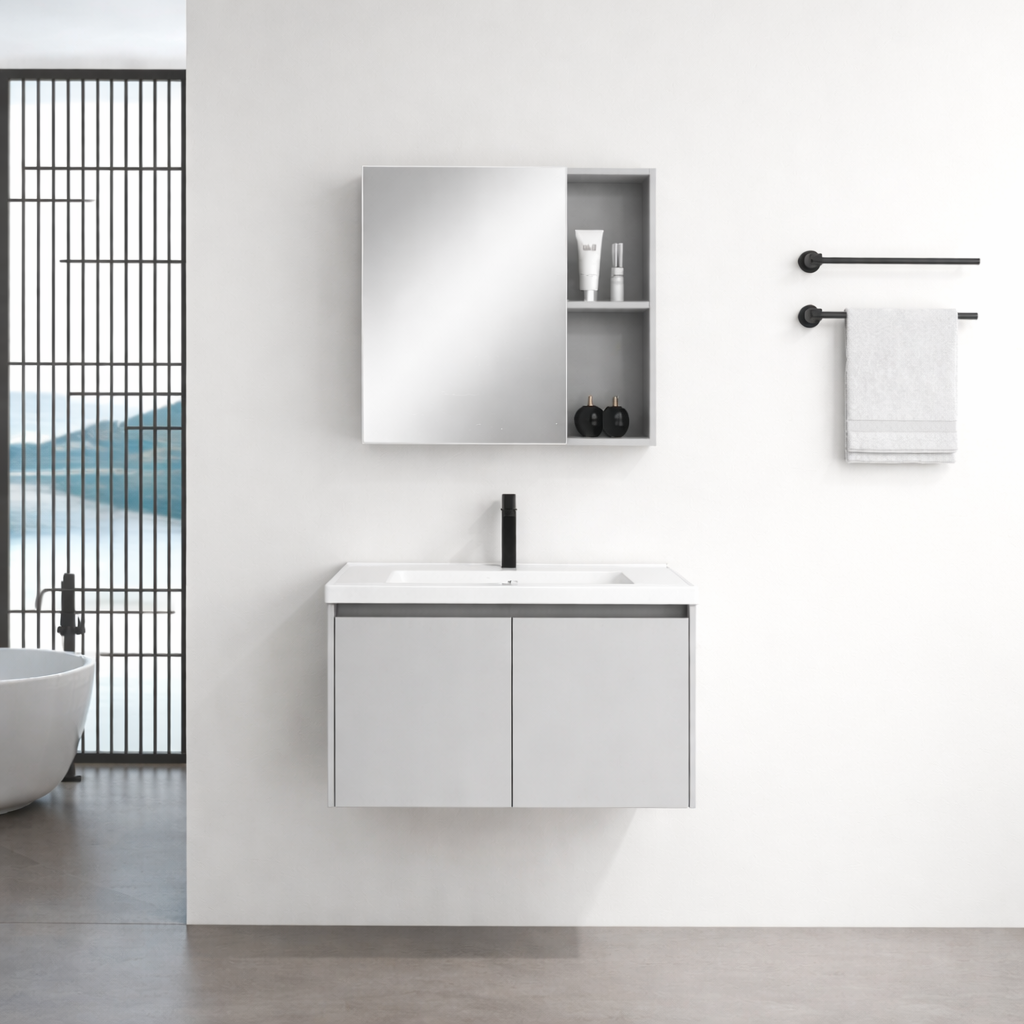 Set Mobilier Baie Modern – Dulap + Lavoar Ceramic + Oglindă LED cu Senzor, Gri Deschis