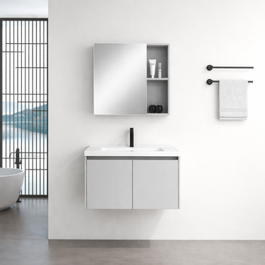 Finisajul gri deschis se potrivește perfect în băile moderne, iar spațiul generos de depozitare ajută la păstrarea produselor de baie organizate și ușor accesibile.