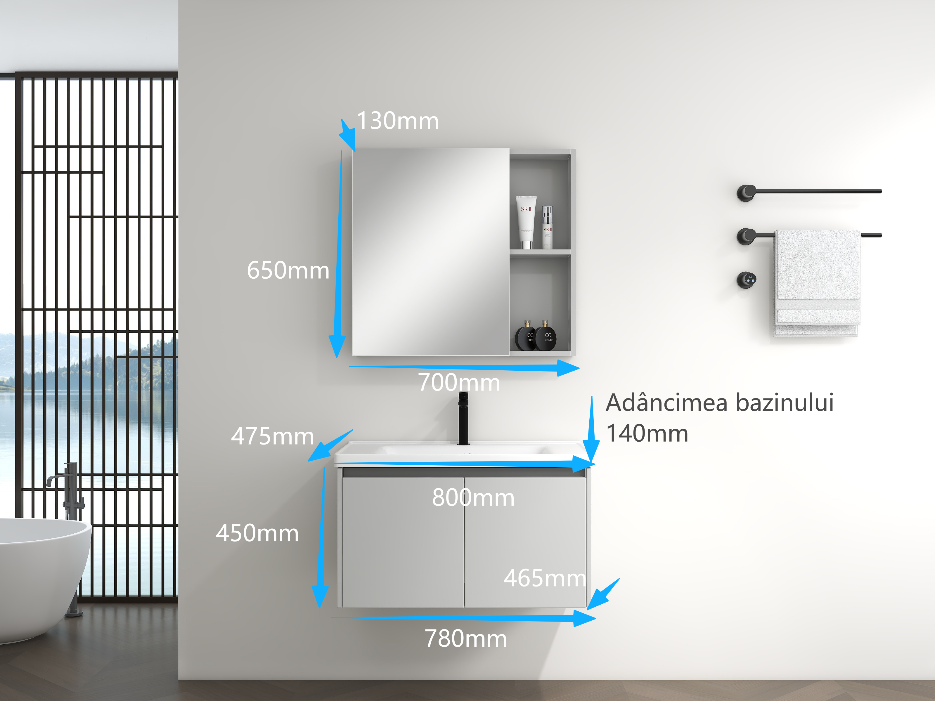 Acest set complet de mobilier pentru baie combină designul modern cu funcționalitatea și materialele durabile. Setul include dulap cu uși duble, lavoar ceramic integrat și dulap cu oglindă cu senzor inteligent.