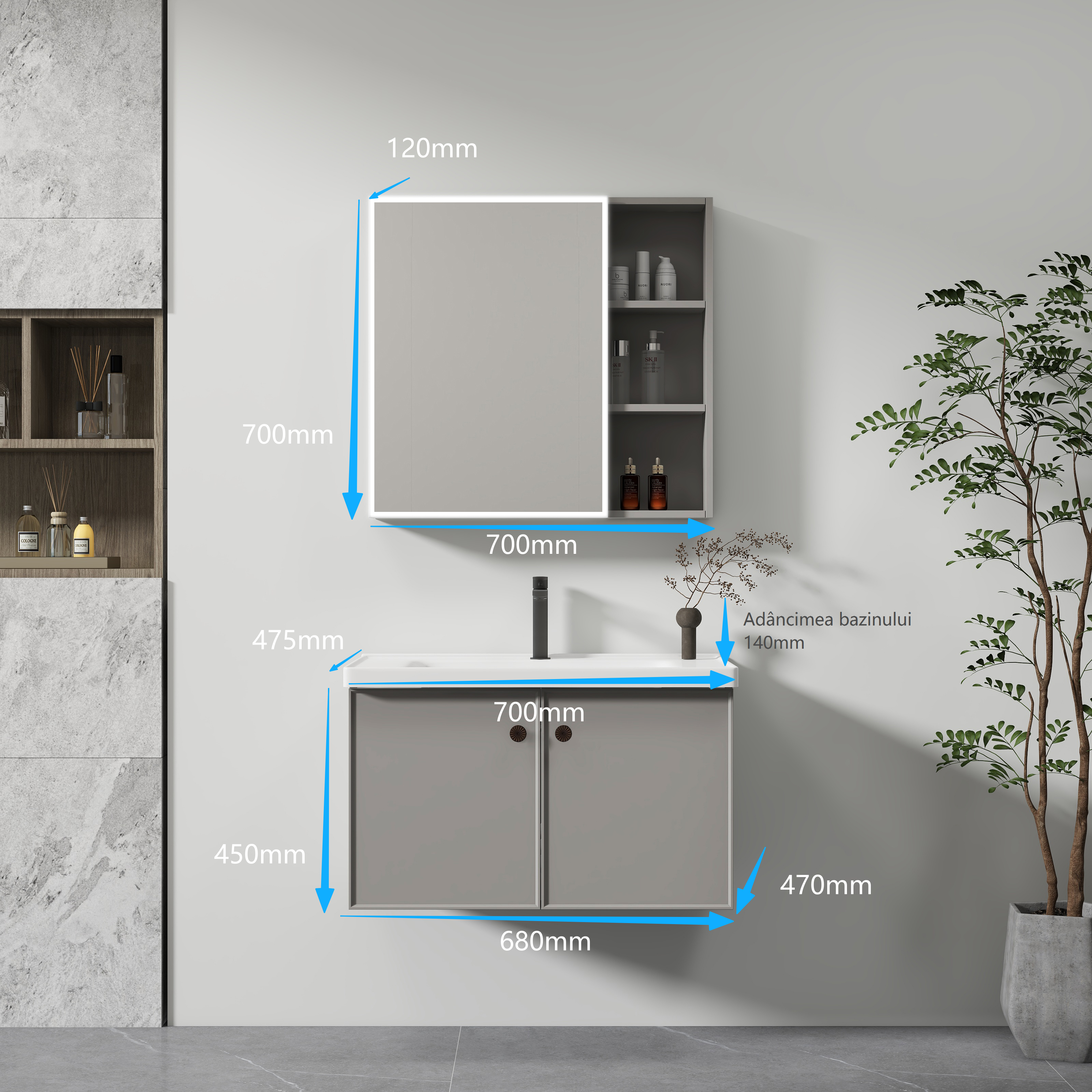 - Design modern gri închis • dulap 700×475×450 mm • dulap oglindă 650×130×700 mm.