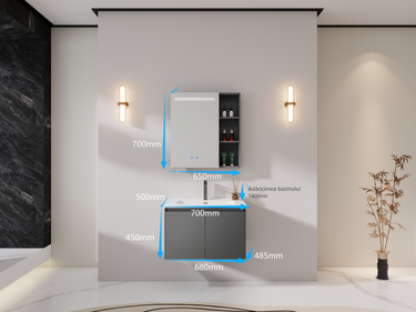 - Design premium gri închis • dulap 700×500×450 mm • dulap cu oglindă 650×130×700 mm.