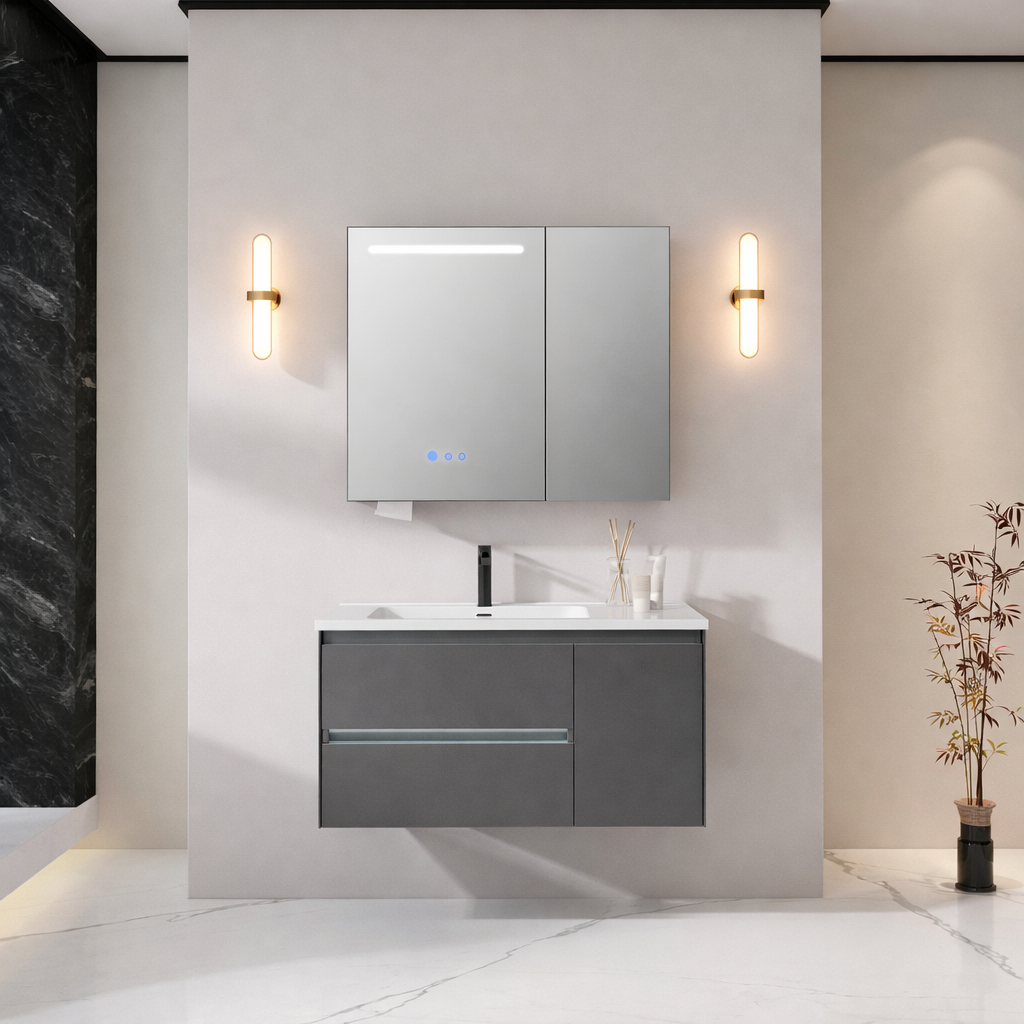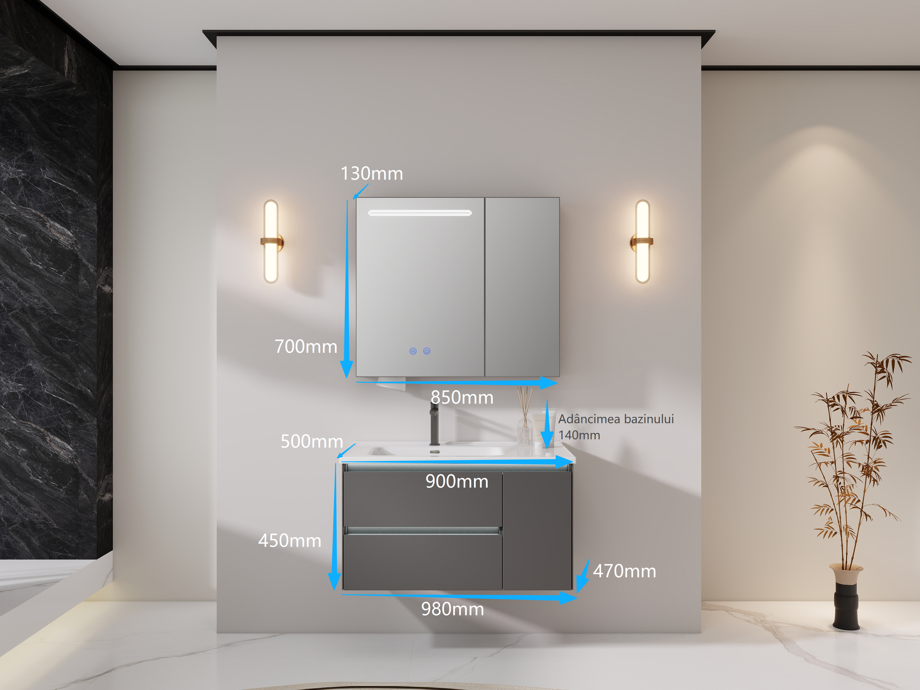 - Design premium gri închis • dulap 900×500×480 mm • dulap cu oglindă 850×130×700 mm.