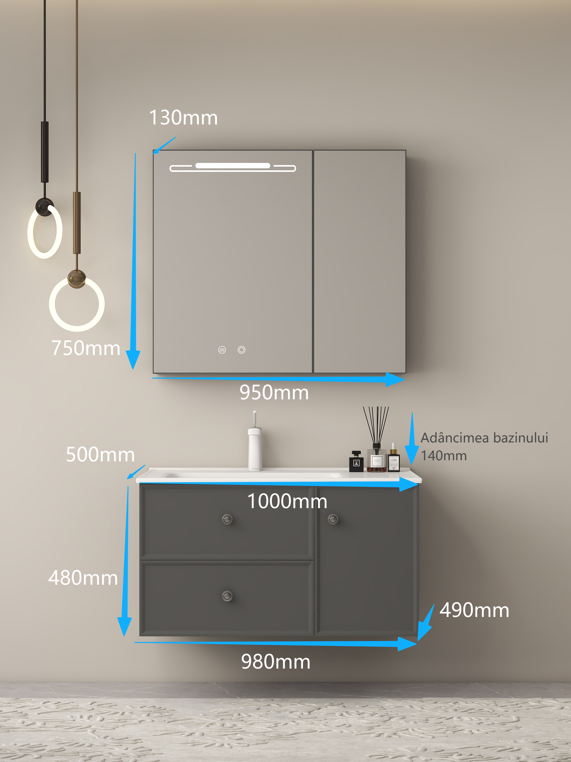 • Design modern gri închis • dulap 900×500×480 mm • dulap oglindă 850×125×750 mm.